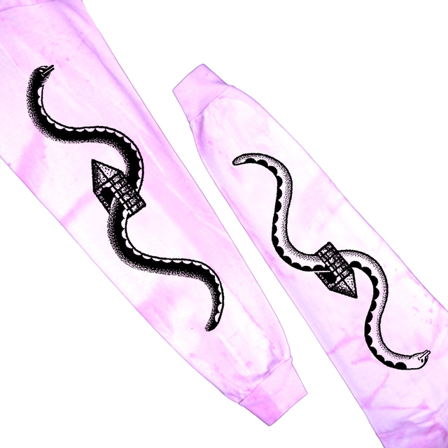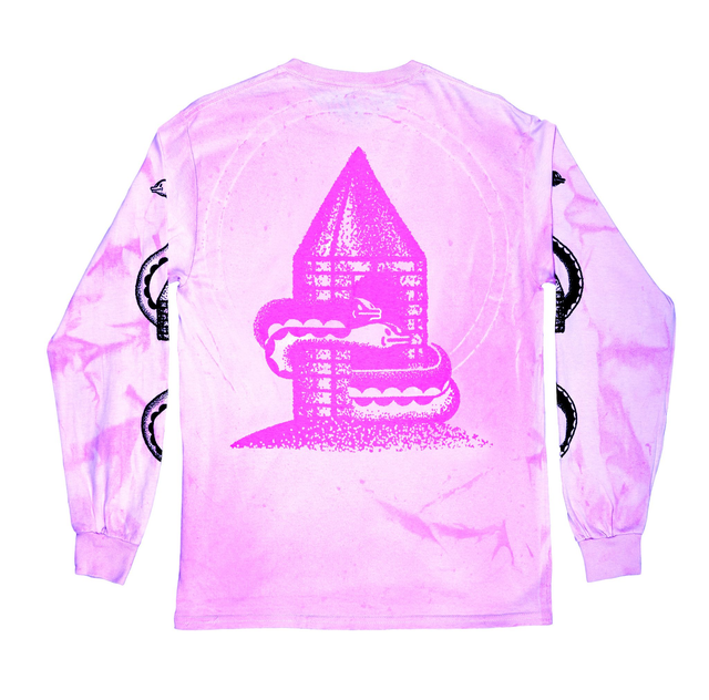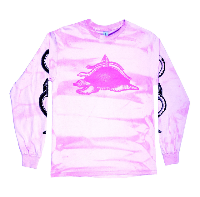 This T-Shirt is truly a one off. Designed and printed by myself at my studio in Margate, I hand dyed each individual garment meaning every single one is unique. The raspberry ripple dye effect is joined by front and back prints in day-glo pink - the front features a Gronder and his two young Glips that are nesting on his shell, with the back of the shirt taking a closer look at the nesting Glips. The T-Shirt is finished off with black sleeve prints, showing each Glip leaving the nest and emerging into the Obliox overgrowth.