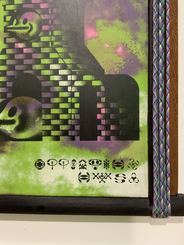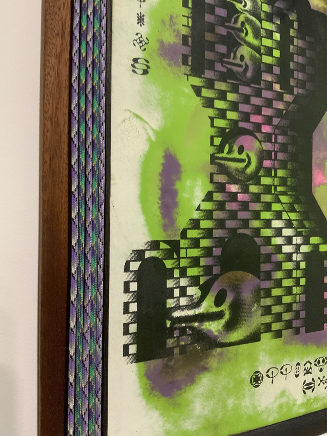 The artwork is a screen print on top of a hand made painted background, framed using a combination of oak and pine and hand finished with paracord rope.
