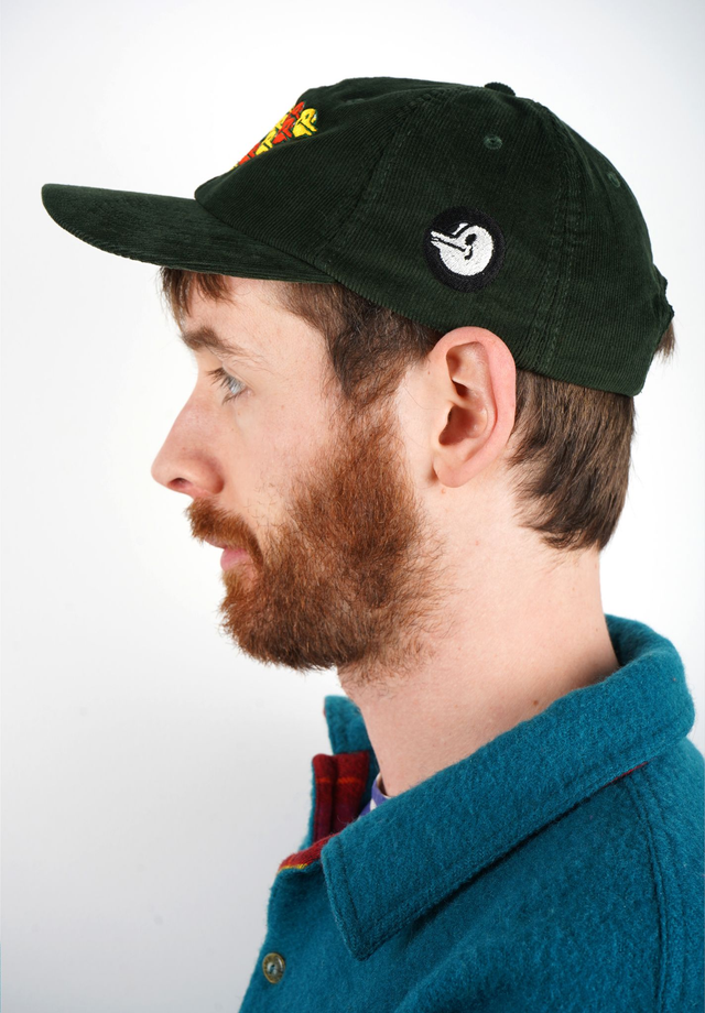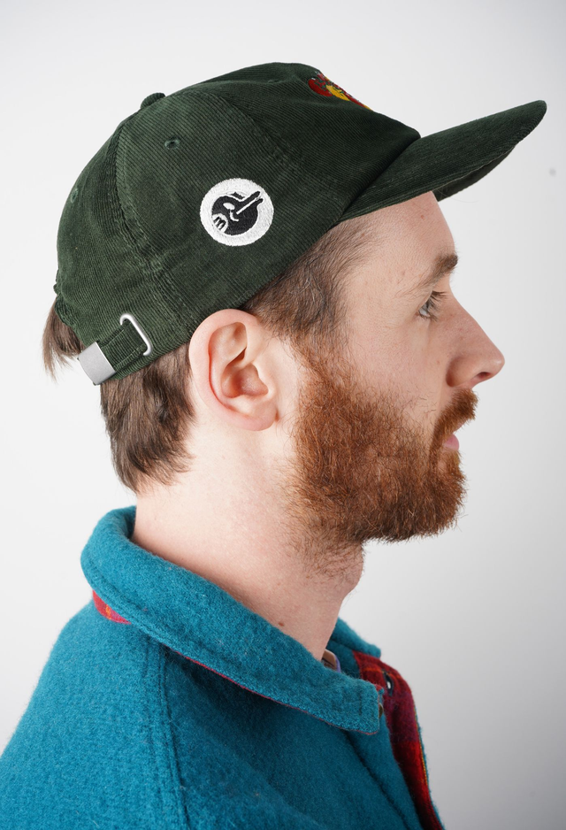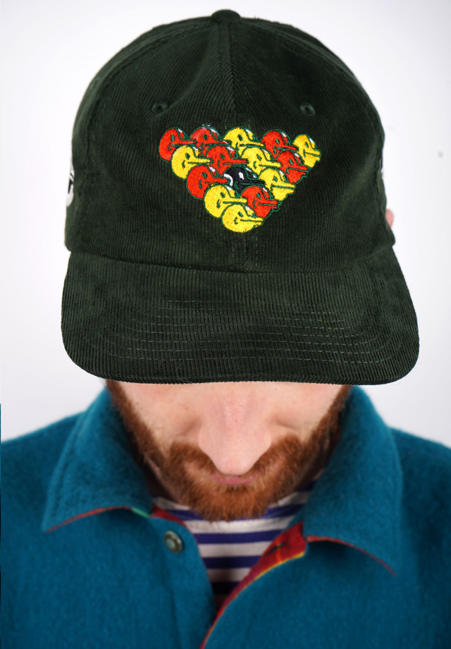 Embroidered forest green corduroy cap featuring the holy triangle - a stacked set of pool balls ready to be cracked into oblivion.