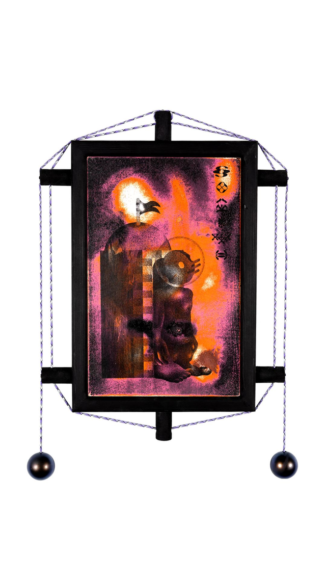 The artwork is a screen print on top of a hand made painted background, framed using stained pine and hand finished with paracord rope and mystical orbs.